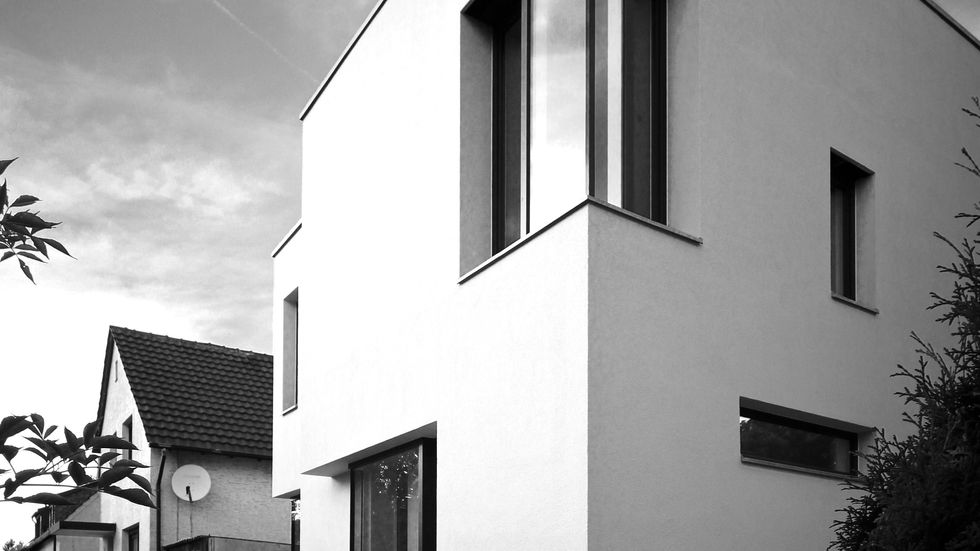 Neubauprojekt mit klarer Hierarchy von dienenden und bedienten Bereichen, die sich als Volumen überlappen. An diese Stellen kommt Licht durch die Fugen und bringen Licht an gezielte Stellen innenhalb des Gebäudes.